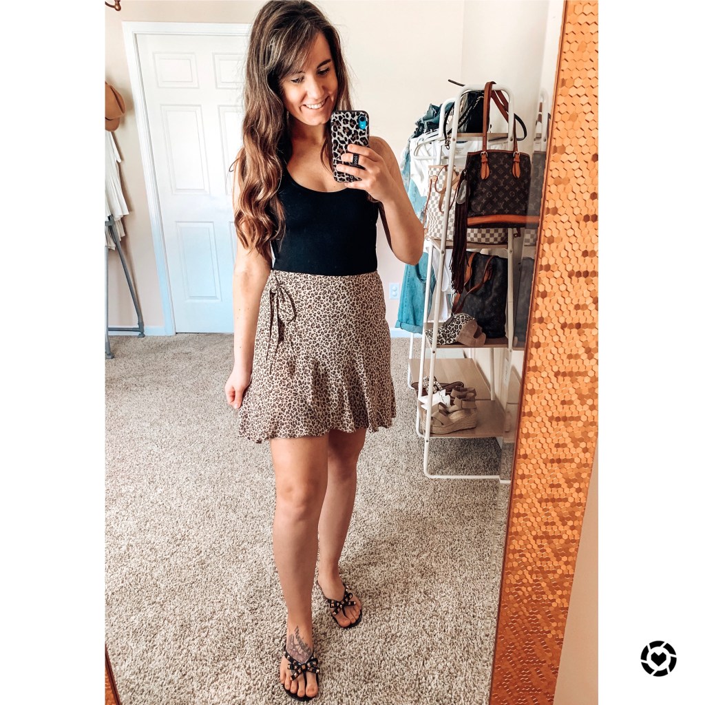 My super cute ruffle wrap mini skirt from Abercrombie is on major SALE right now plus and extra 25% OFF at checkout, making it only $25.00! Hurry and snag it, only a few sizes left last I checked! My black tank bodysuit is from Chasing Chloe Boutique! I paired my super cute Valentino dupe studded bow sandals with this look. Links below!