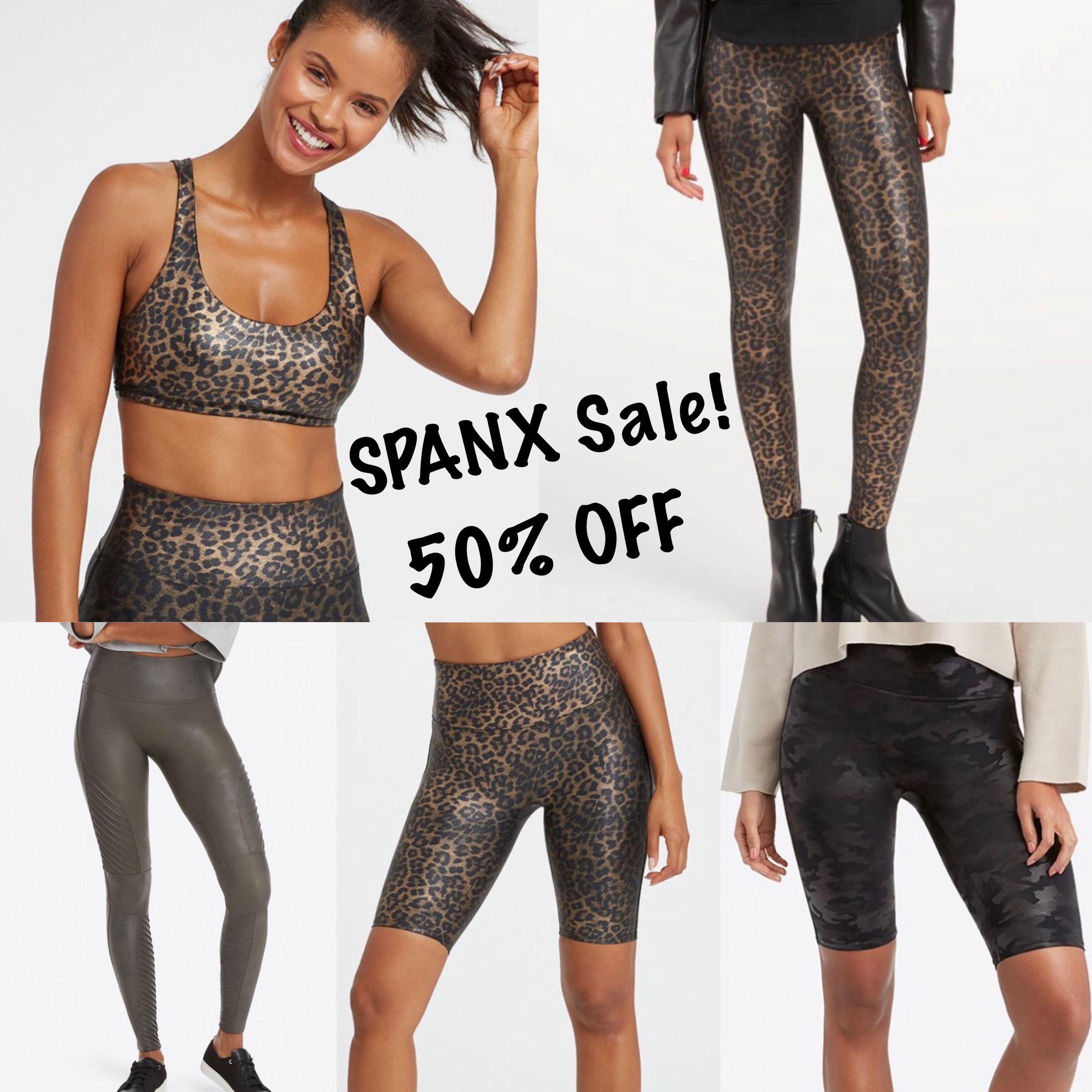 Spanx SALE!! These super cute spanx faux leather leggings and bike shorts are 50% OFF right now! The matching sports bra to the leopard bike shorts and leggings is also 50% off! Links below!