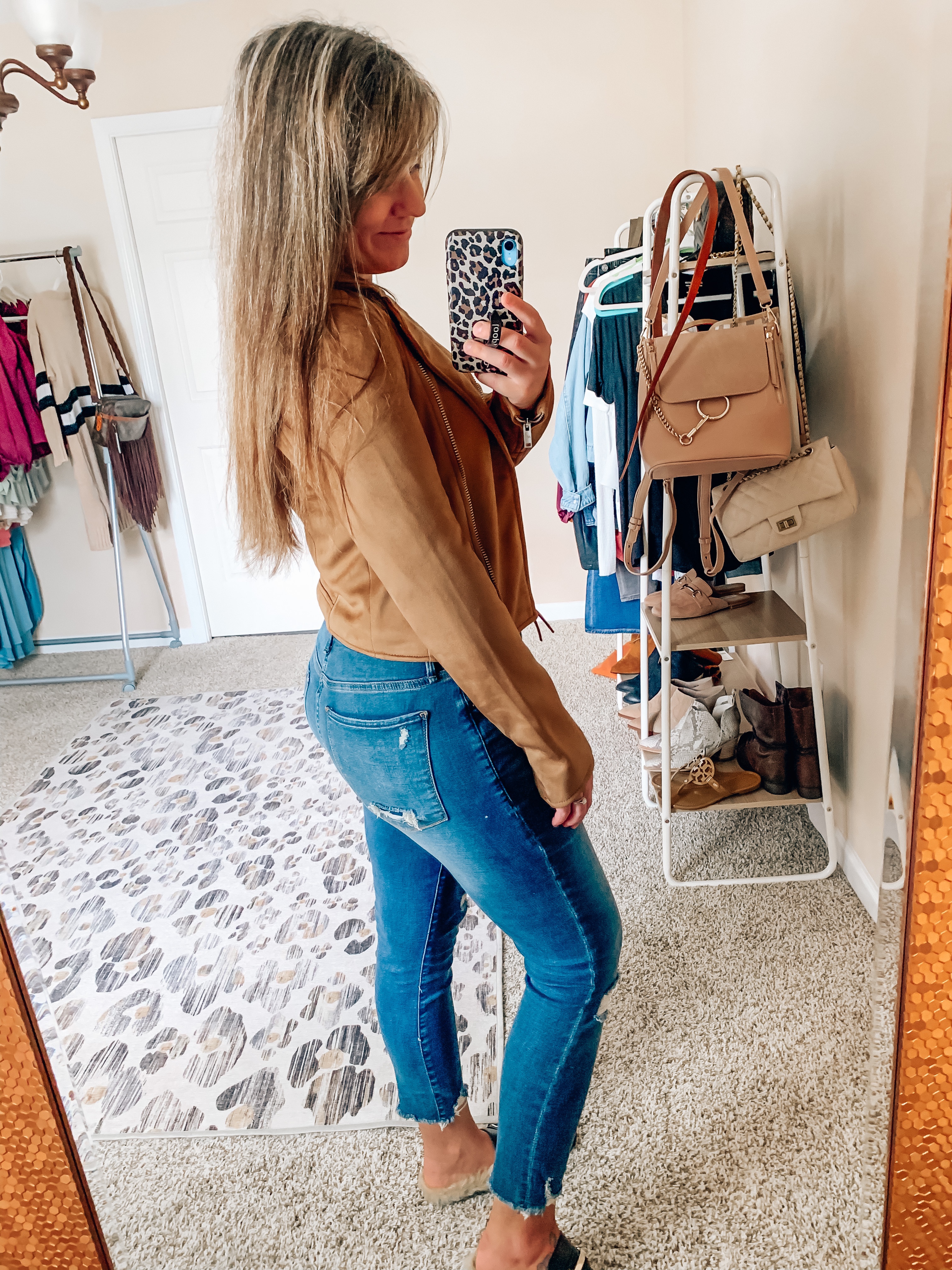 My new favorite faux suede moto jacket is 20% off today! This is definitely a more “fitted” style jacket (size up one or two sizes if you want a looser fit)! This jacket is so soft and the quality is amazing 😍 It also comes in a few different color and leather options! This piece is definitely going to be a staple in my fall wardrobe 🍂 link to the jacket below