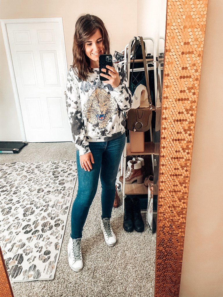 Sunday comfy style π in love with this Def Leppard sweatshirt! Itβs so soft, cute and oh so comfy. And these jean leggings are my absolute favorite! They are BOGO 50% OFF right now. This outfit is linked below!