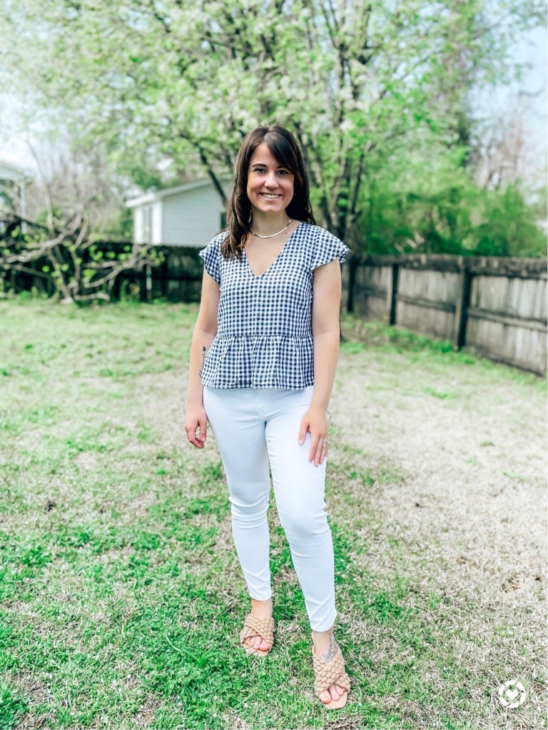 Gingham print is “in” this spring and I love this adorable top! It’s so cute with a pair of white pants or shorts and some cute sandals. Linking this look below!