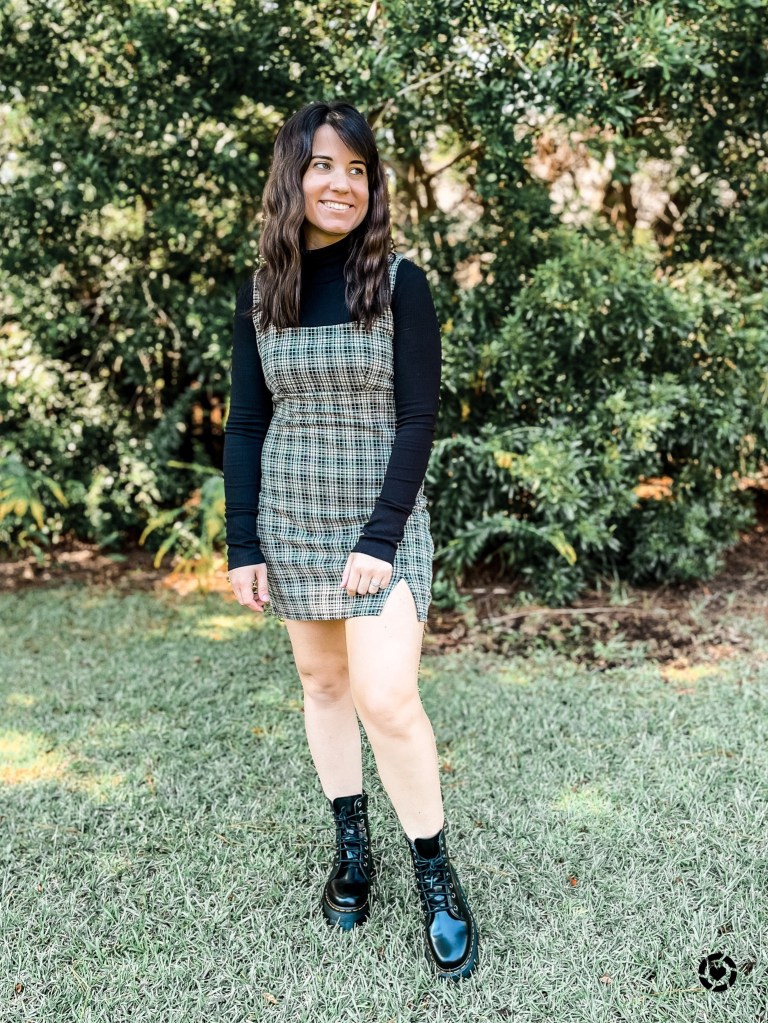 Loving this look for fall! This plaid dress is so cute and comfy too. Itβs stretchy, so stick to your true size! I am wearing the size medium. Paired it with a black bodysuit and my combat boots! You can shop this look by clicking the links below